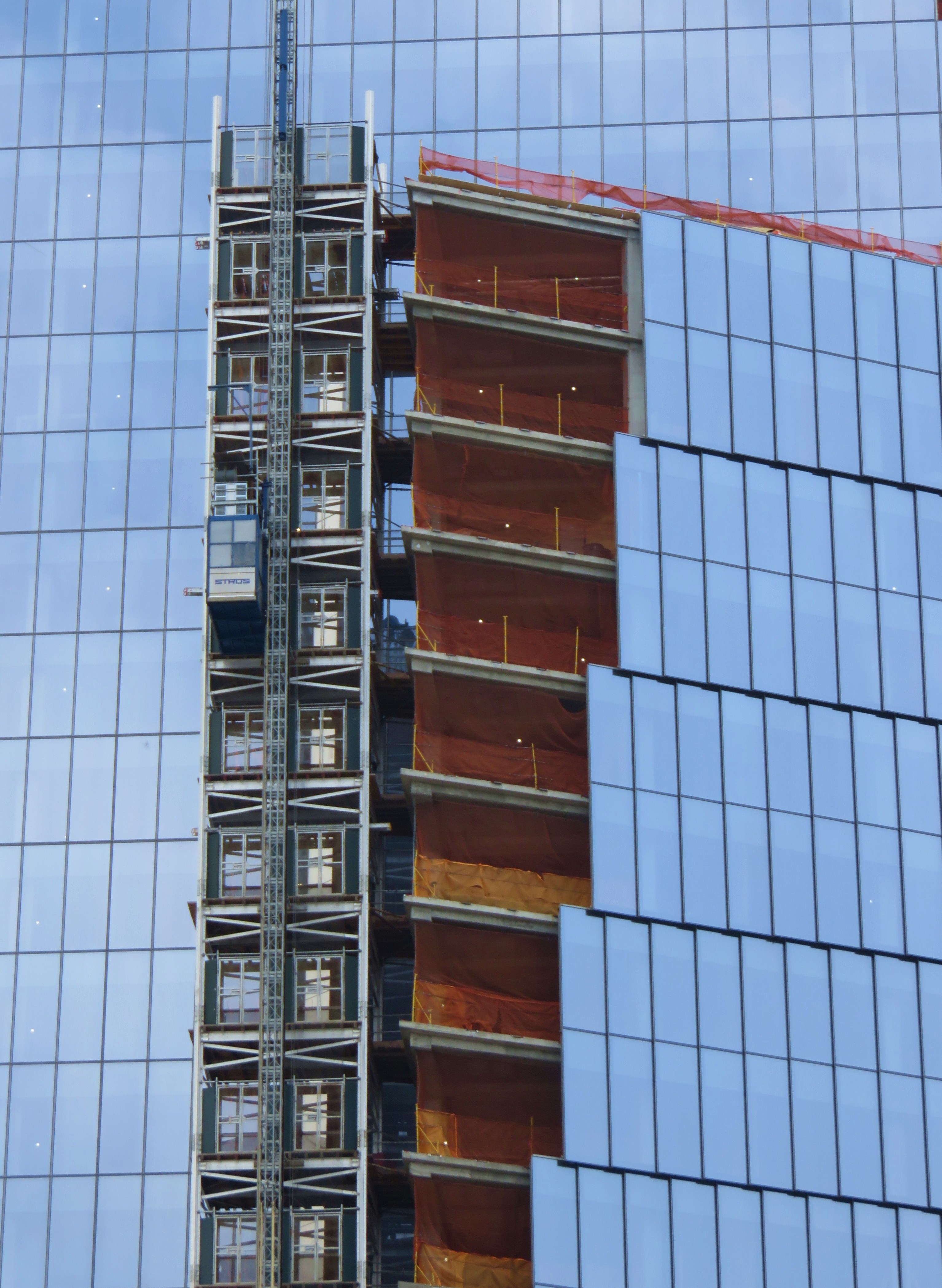 dusk. Raindrops mirrored the skyscrapers and sidewalks. The night glittered with magic and in the  daytime, the blue sky reflected off buildings under construction, partly revealing  gritty  underpinnings that would soon be  obscured by a  new shiny skin.